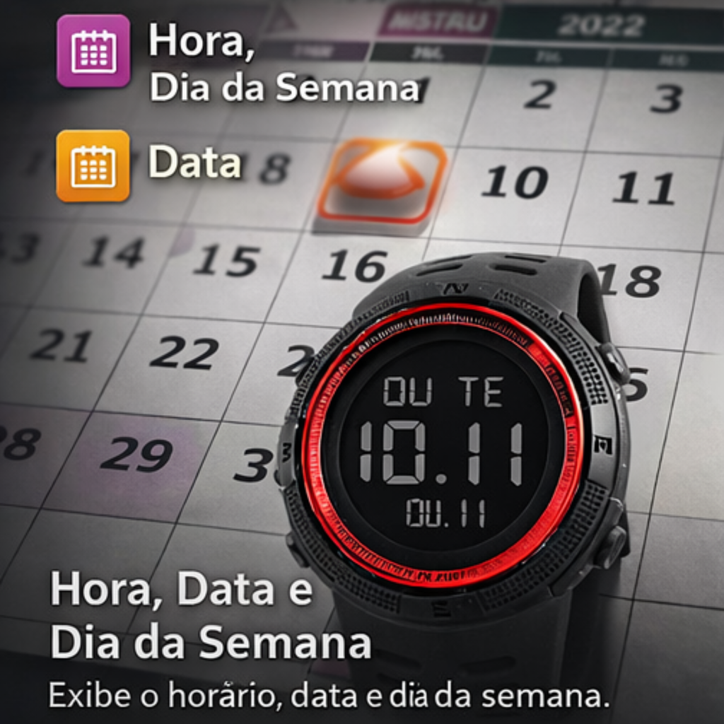 Este relógio eletrônico foi feito para homens, adolescentes e estudantes que curtem design robusto, funções inteligentes e visual moderno.
